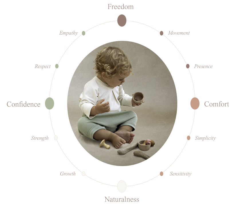 We watch how our children’s first explorations, enabled by baby clothes that allow freedom of movement, shape their inner freedom, and how these